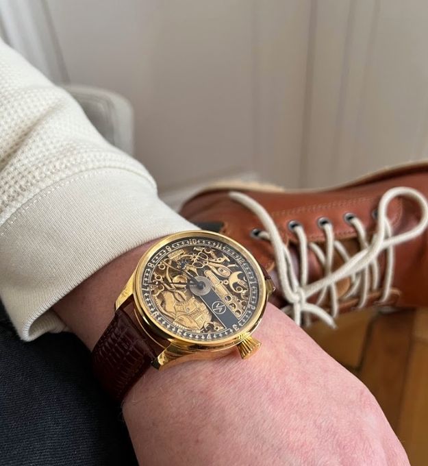 To nejzajímavější se ale ukrývá uvnitř. Srdcem hodinek je starožitný švýcarský strojek značky ZENITH, který poprvé ukázal čas už v roce 1900. Strojek osázený 15 rubíny původně bydlel v historických kapesních hodinkách. Pavel Šmek mu ale po pečlivé a citlivé restauraci našel jiný domov. Konkréntně v nově vyrobeném, pozlaceném pouzdře z oceli. Dal tak vzniknout originálnímu sběratelskému kousku, který existuje v jediném provedení.