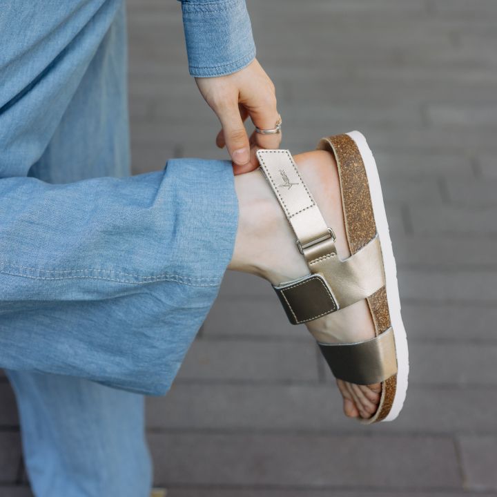 V kožených páskových sandálech Sany jsou jako stvořené na léto. V ruchu města se s nimi neztratíte a díky zlaté barvě jsou vhodné na každou (i slavnostnější) událost. Suché zipy na nártu a patě umožní nastavení pásků podle potřeby a anatomická stélka se postará, aby vás nebolely chodidla i po celém dni na nohou. Lidský dotek našich zlínských ševců a kvalitní pravá kůže dělá z těchto páskových sandálů záležitost mnoha sezón.